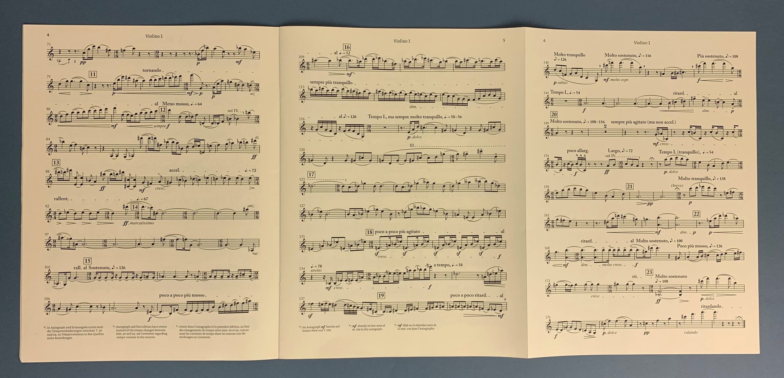 So war von Anfang an klar, dass wir in den Oberstimmen im I. Satz mit den drei Seiten der dicht gedrängt bedruckten Erstausgabe nicht auskommen würden. Vielmehr erschien es sinnvoll, in Violine 1 die ersten 70 Takte, die in der Erstausgabe auf einer einzigen Seite stehen, sogar auf eine Doppelseite zu verteilen: So bleibt die gute Blätterstelle bei Probeziffer 10 erhalten, zugleich haben wir ein übersichtliches Layout, in dem auch Stichnoten und Fußnoten genügend Platz finden.