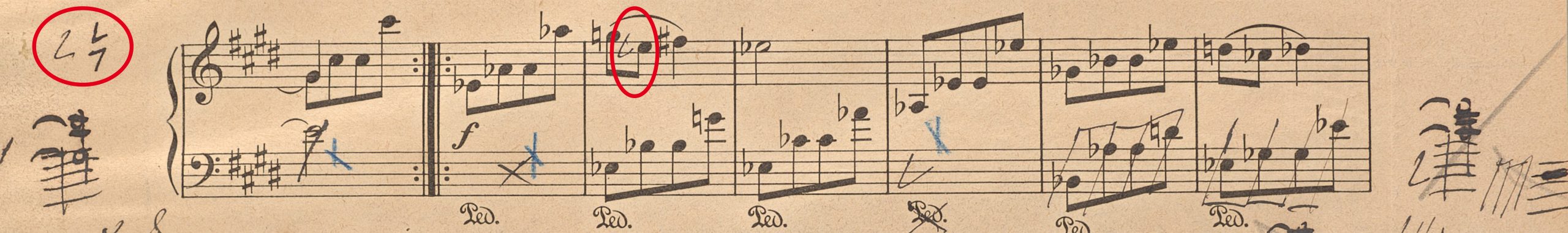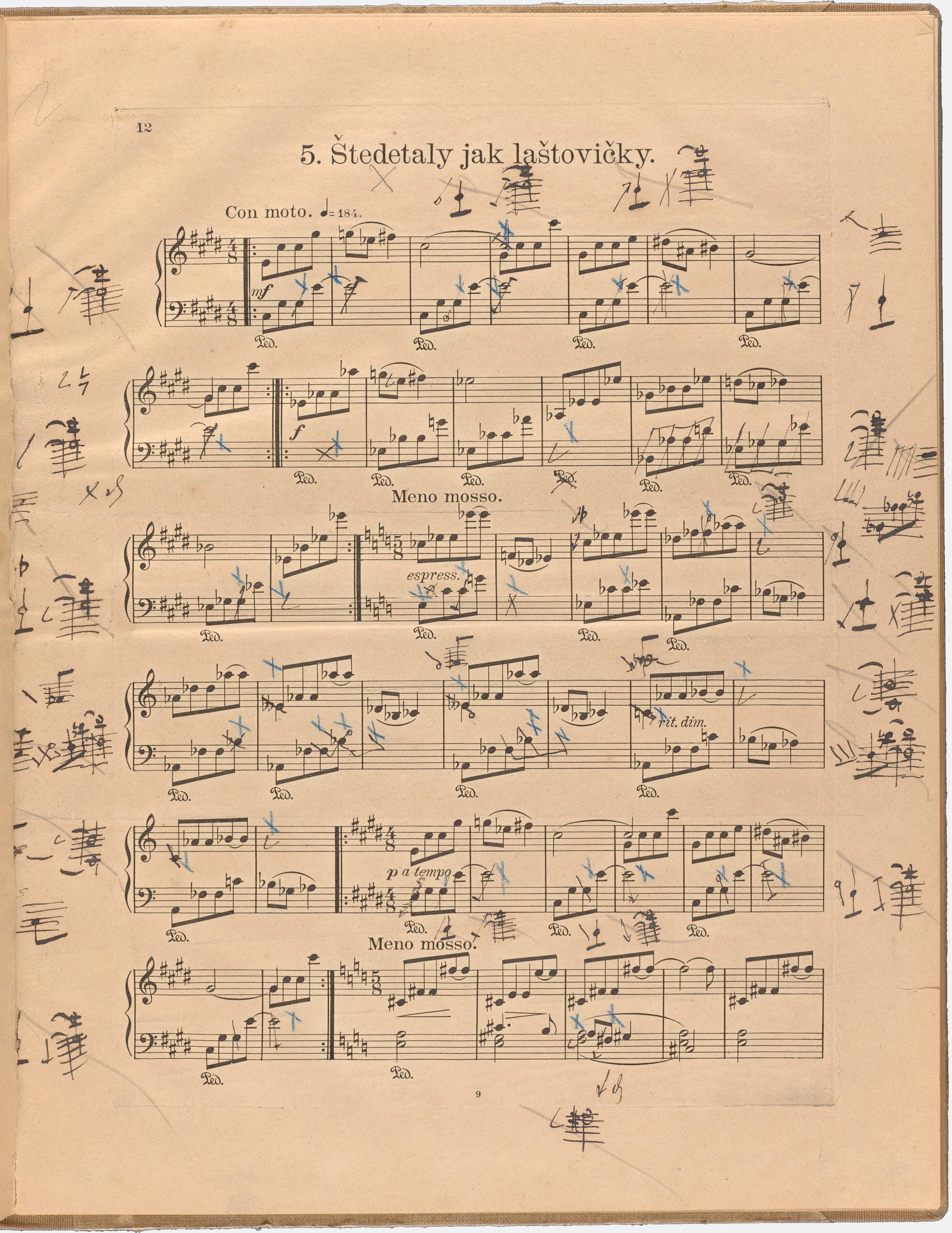 Das zweite Beispiel stammt aus Nr. 5, Reihe I. In T. 10 lautet die 2. Note der rechten Hand in der Erstausgabe eindeutig es2. In der Abschrift hingegen (in diesem Fall die einzige frühere Quelle) steht ein e2, mit Warnvorzeichen ♮. Was ist richtig? Die frühe Fassung oder die späte? Ein Blick in den Korrekturabzug enthüllt Erstaunliches. Der Stecher der Erstausgabe hatte nämlich ursprünglich ein e2 gestochen, allerdings ohne Warnvorzeichen. Janáček ergänzte im Fahnenabzug ein Korrekturzeichen vor dieser Note und schrieb in den entsprechenden Randvermerk eindeutig ein ♮.