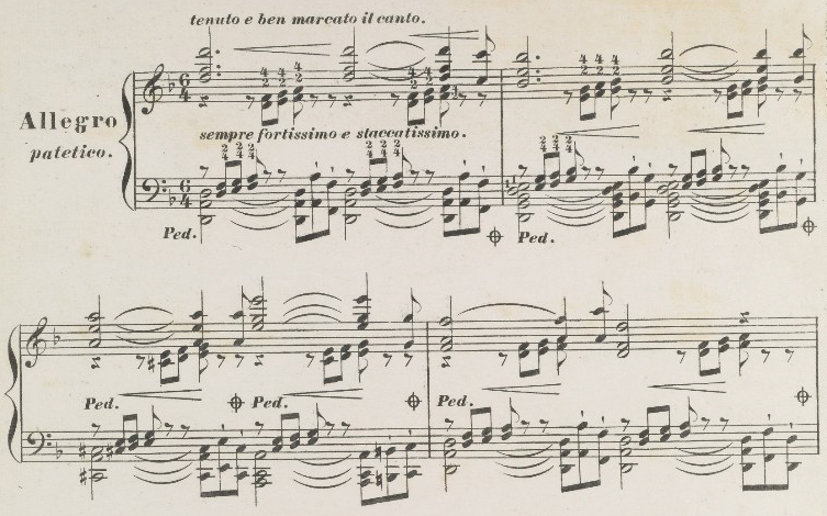 – Liszt bezieht die Melodik der rechten und die Bassführung der linken Hand direkt aufeinander und will sie deshalb auch orthographisch-optisch gleich behandeln, wie Notenwerte und Strichpunkt-Artikulation zeigen.