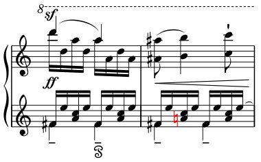 2) Similarly, but in the opposite direction is the next example: Emmanuel Chabrier, Bourrée fantasque, measure 166 (HN 1162): here the same tone is raised (a♯, upper stave), subsequently notated in another octave register in a form not raised (a, lower stave). For Chabrier playing a¹ in the left hand was obvious (see the preceding measure), so he did not put a cautionary accidental. Is then the ♮ superfluous or does it nevertheless clear up any possible doubt?