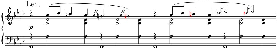 1) Let’s start with a ‘classic’ case: the altered tone f♯¹ returning in another part (here even played by another hand), taken from the new edition: Gabriel Fauré, Violin Sonata No. 1 in A-Major Op.13, movement II, measure 4 (HN 980).