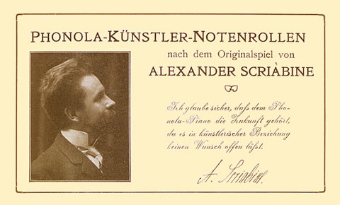 Alexander Scriabin (1872–1915) was not only one of the outstanding composers in Russia around 1900. Time and again he also appeared publicly as pianist – especially as interpreter of his own works. His compositions are at present among the standard items in the concert repertoire, but today we can also still get an idea of his piano playing. Twice, in 1908 and 1910, Scriabin had recordings of his playing made on the player piano (pianola). In 1908 a recording session took place at the Hupfeld firm in Leipzig, in 1910 Scriabin was captured on piano rolls by Welte-Mignon in Moscow (we recommend this link to the Pianola Institute to anyone wanting to grasp in more detail the various recording techniques and firms). Scriabin was obviously taken with the results. In a Hupfeld sales brochure there is a composer testimonial quoting a comment by Scriabin: