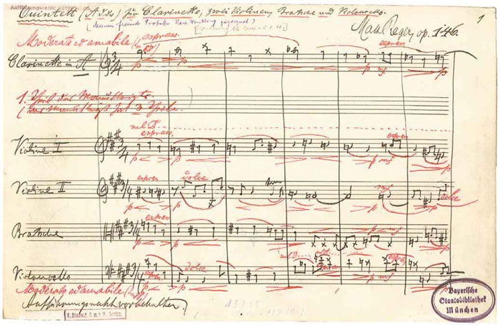 Not for nothing did Max Reger usually opt in his autographs for a second colour (red instead of black) for indicating this parameter – which indeed makes the thing prettier though not necessarily also easier to read, as shown by the dynamics notated now above, now below the staves, or the espressivo information squeezed into the stave on the first page of his clarinet quintet.