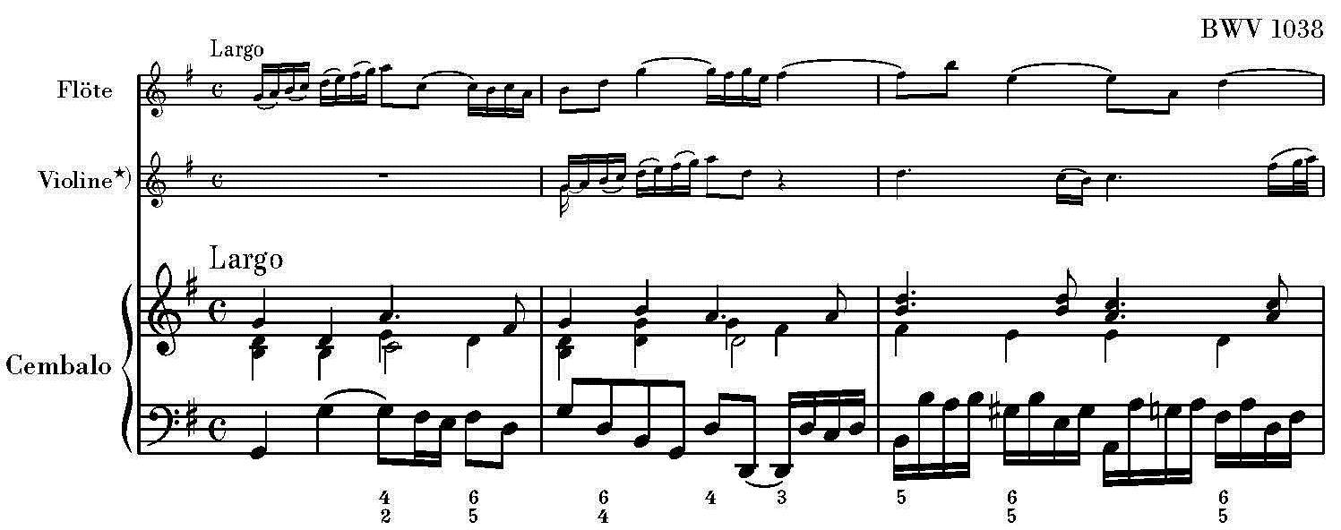 This question might at first appear trivial. Presumably every pianist nowadays has already once accompanied baroque chamber music from a basso-continuo part. In the G. Henle Verlag – and not only at our publishing house – this part is basically a stave for the left hand. It contains the bass part, mostly with numbers indicating which chords are to be played by the right hand in each case. The stave for the right hand suggests in small type how the harmonisation is to be realised (see the following example, the beginning of Bach’s Trio Sonata BWV 1038)