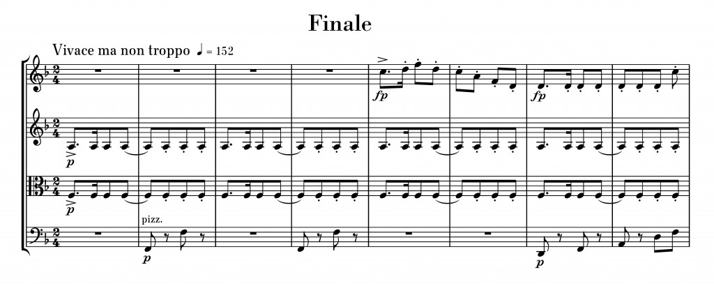 An especially prominent example of a rhythmic ostinato, that is, a characteristic accompanying, rhythmic formula repeated unmodified over many measures, opens the finale of opus 96.