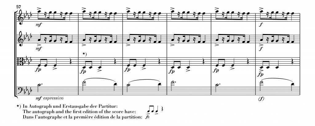 Looking here at the sources reveals, though, a noteworthy difference. Whereas the first edition of the viola part consistently puts the accent on the third note, the first edition of the score shows an additional accent on the 1st note in measure 58.