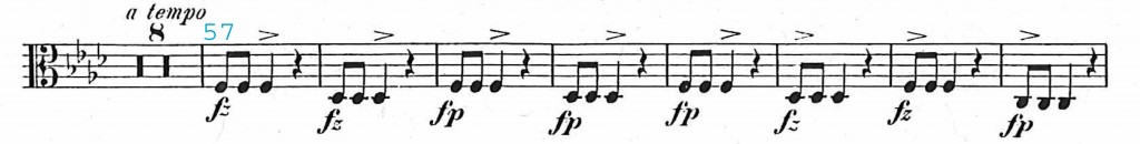 The ostinatos in question present two variants: as either continuously sounding on the same pitch or as alternating on two or three pitches, but always according to the same model of repeated rhythms. In the scherzo spot mentioned, we are concerned with the second variant: The violins, with their marked rhythm, define the space of an f-minor third, whereas the viola affirms by alternating between f and d flat the theme’s harmonic modulation between f minor and D-flat major. But at the same time the viola part provides with the accent on beat two (only changing to beat one in mm. 62 ff.) a rhythmic counterpoint to the heavily stressed first beat of these measures.