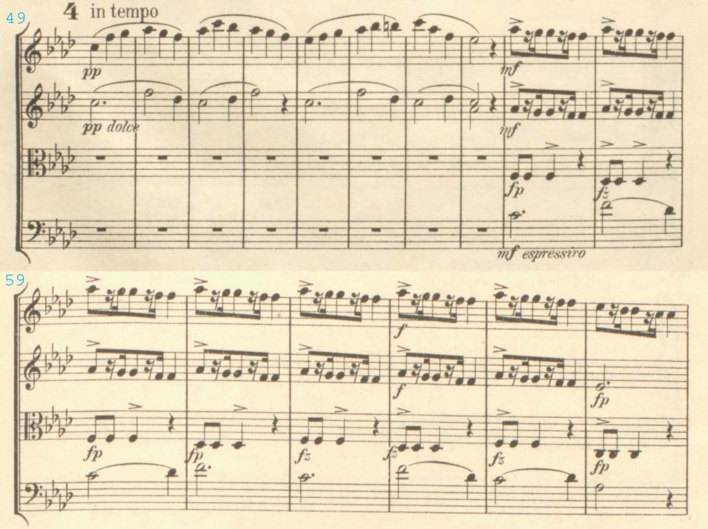 I’d like to concentrate in the following on a spot in the scherzo of the quartet that I came upon while preparing the new edition appearing before long (score and parts), and posing more pointedly the question of “Bohemian” (read “Czech”) or “American” influences in a passage with an ostinato rhythm. It has to do with measures 57 ff., where the theme stated by the cello is doubly counterpointed by rhythmic ostinatos.