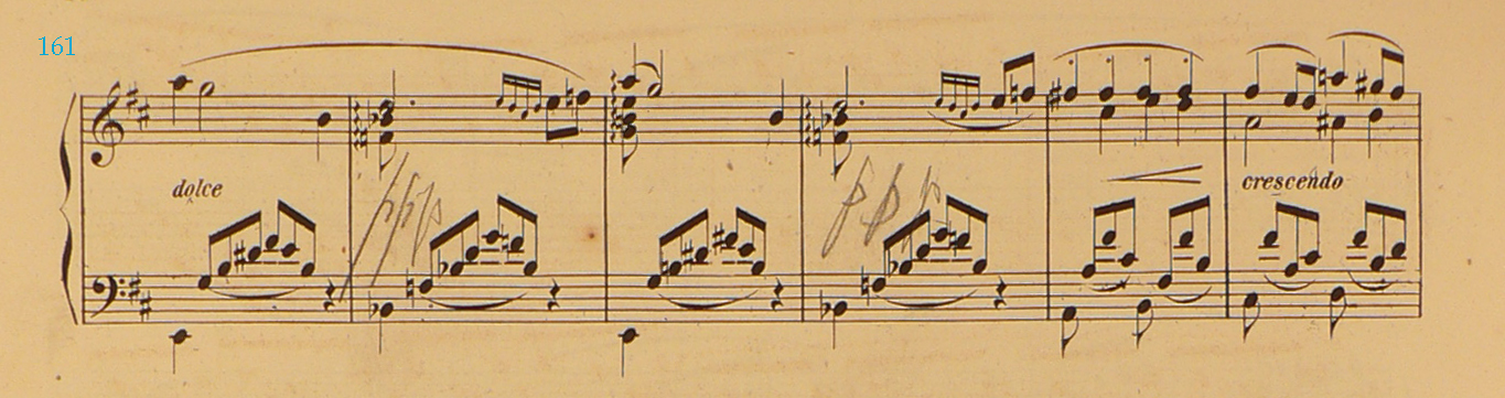 Breitkopf & Härtel first edition: Copy of Árpád Szendy with handwritten inscriptions by Liszt, mm. 161–166