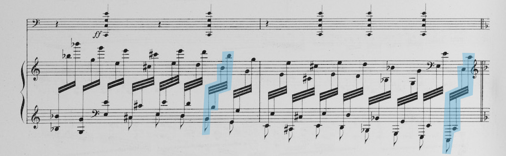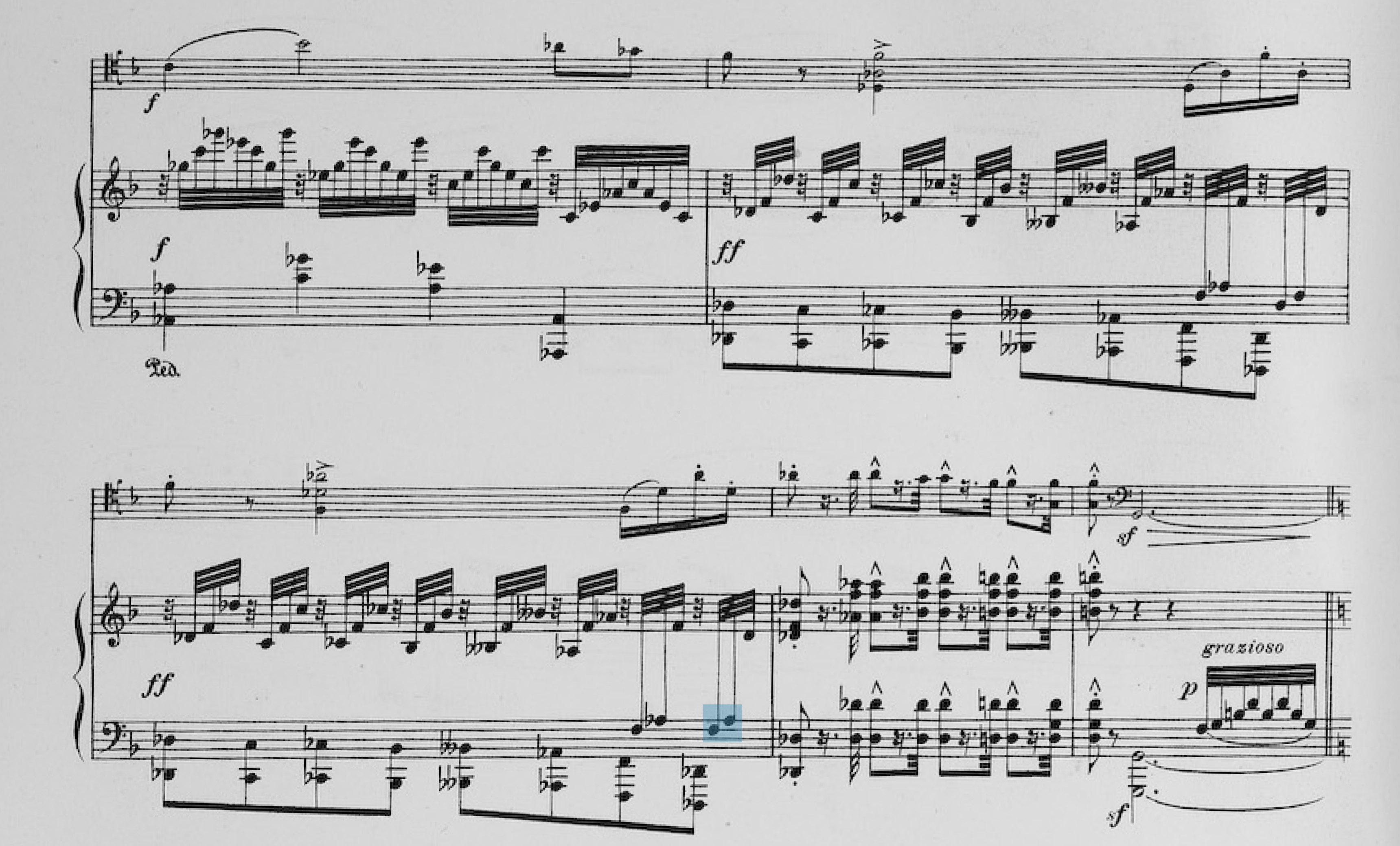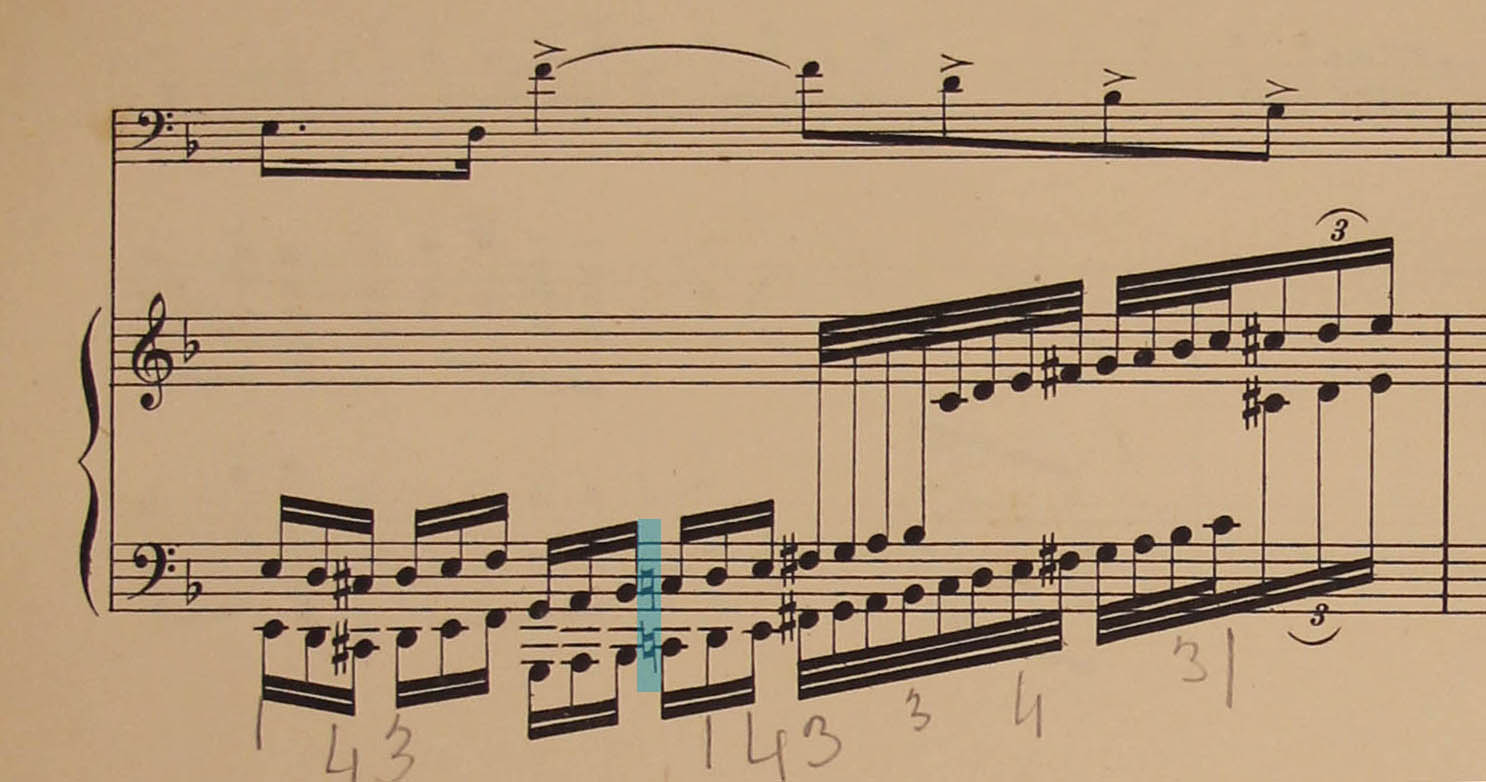 Yet Saint-Saëns notates b flat–g–e–c sharp–e–d (and repeats this sequence in the subsequent octaves), thus avoiding the dominant root and replacing it, as it were, with d, prepared by the neighboring tones c sharp and e.