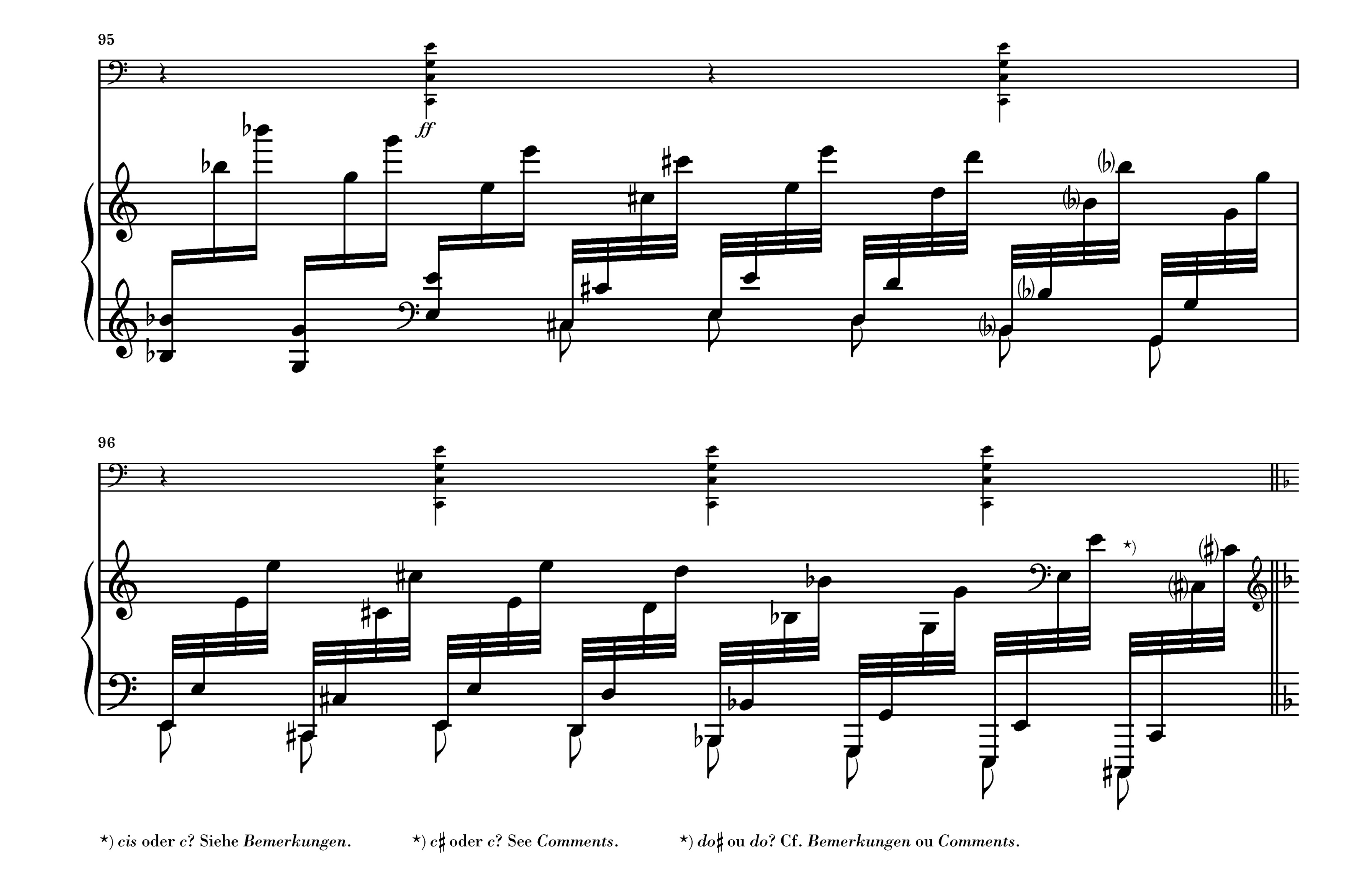 But looking more closely at the autograph, it occurs to us that accidentals are already missing in measure 95. Saint-Saëns notated ♭, that is, only once at the start of the measure, but due to the changed octave register it would have to be repeated in beat 4. The composer apparently follows here the earlier (and in his time no longer valid) principle of having accidentals apply for all subsequent octave registers up to their cancellation. Based on this principle, there is no longer any doubt about the fourfold c sharp at the end of measure 96.