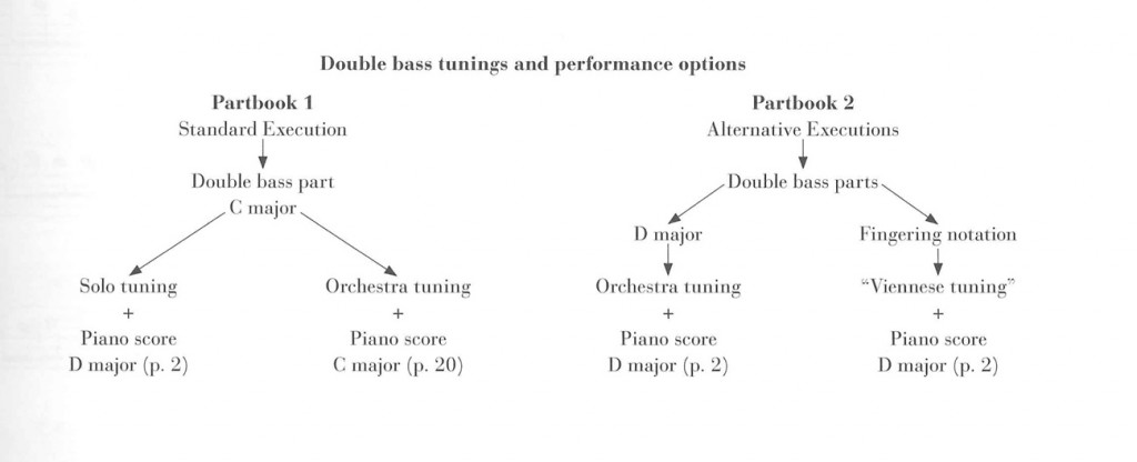 In order to take all this into consideration, enclosed in the edition are two separate volumes of double bass parts: printed in volume 1 is the most frequently played version in C major; volume 2 is devoted to the variant in D major as well as to the historic “Viennese tuning” (A-d-f sharp-a). The latter is immediately playable from the printed, easily understandable fingering notation, and without tedious relearning. For specialists with experience in “Viennese tuning” there is additionally an Urtext part without fingering notated that can be downloaded from the Henle website.