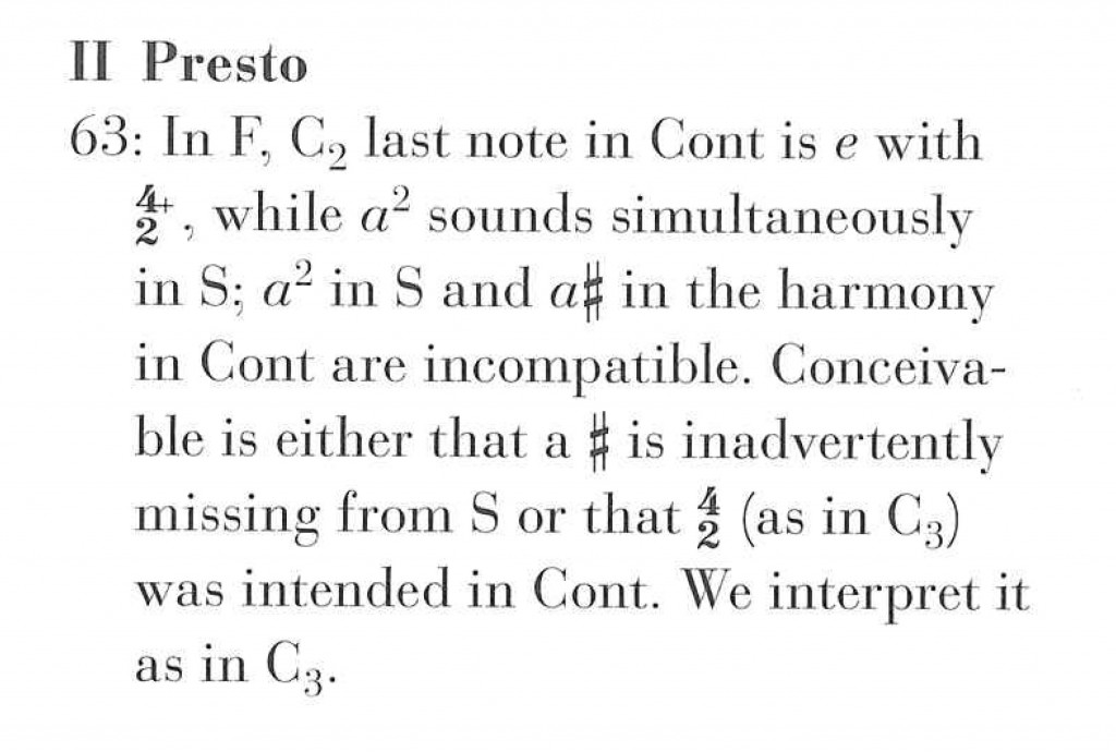 There are contradictions in the music text in a very few spots, such as, for instance, in Sonata quarta, 2nd movement (Presto), m. 63. Here Telemann notates an a2 as the final note of the solo part. The thorough-bass figuration gives, on the other hand, a 2 and a 4+ under e in the bass, resulting in a harmony with f sharp and a sharp, a sharp in the continuo against a in the solo part. Did Telemann forget to put the sharp accidental before a2 in the solo part, thus really meaning a sharp2? Or did an error creep in while engraving the thorough-bass figuration and it should actually be 4 instead of 4+ there? Deciding this is difficult because both readings are conceivable.