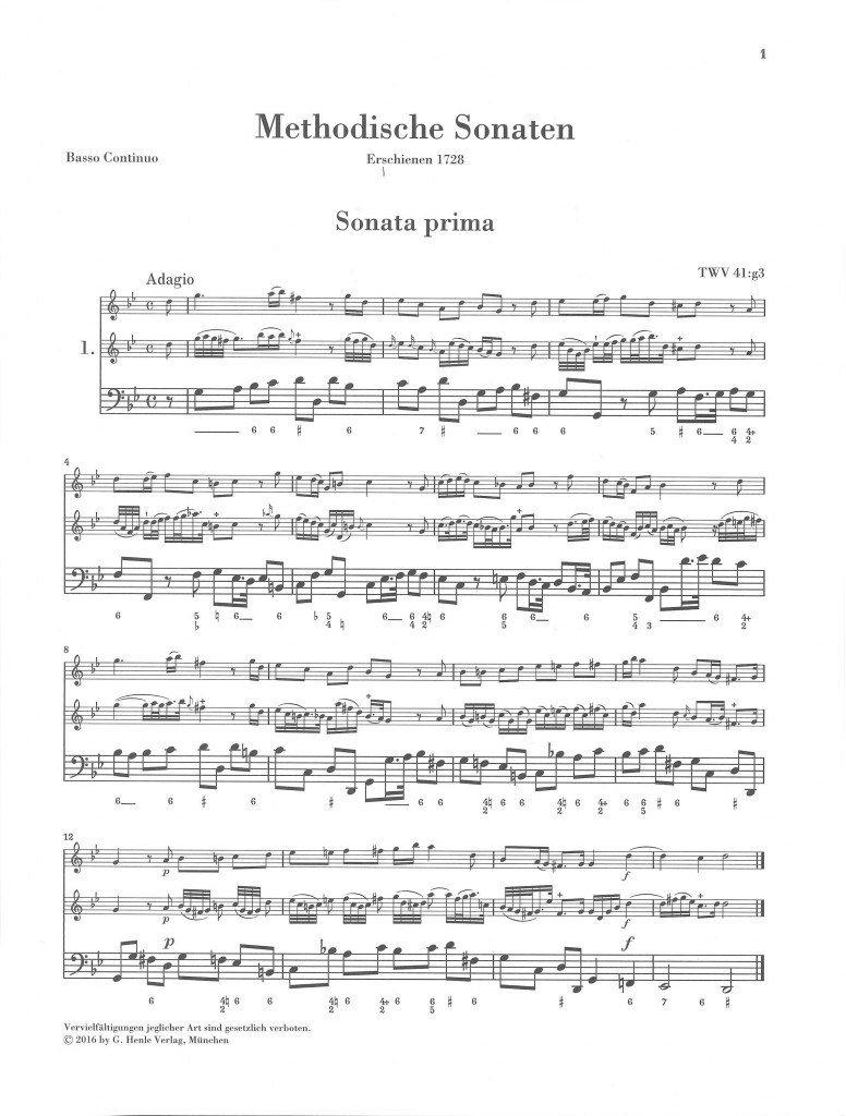 It was nearly three years ago, on 17 February 2014, that my blog post on a luxuriously appointed Henle Urtext edition of Bach’s Trio Sonata BWV 1038 appeared. At that time I wrote that we are upgrading reprints of baroque chamber music in order to outfit them also with a continuo score, added bass part, etc. What was not mentioned in this post, but actually taken for granted is: New editions scored with continuo are likewise opulently equipped. Another such deluxe edition has appeared recently, to which I’d like to refer here: Telemann’s Methodical Sonatas, Part I, with sonatas 1–6 (HN 1266).