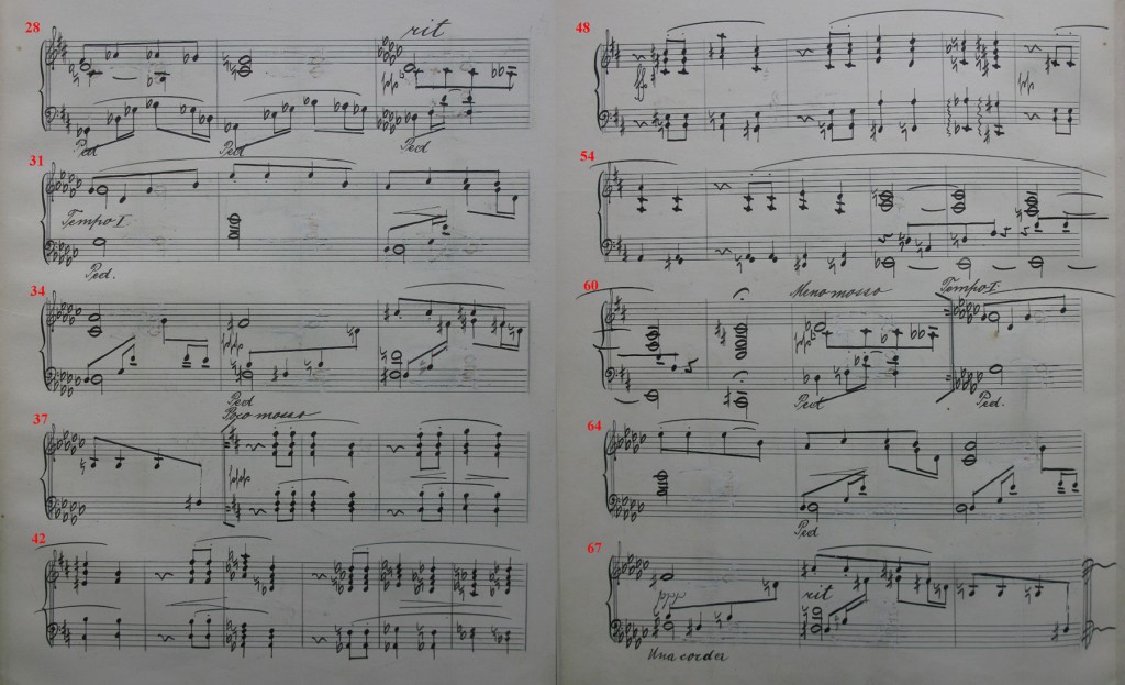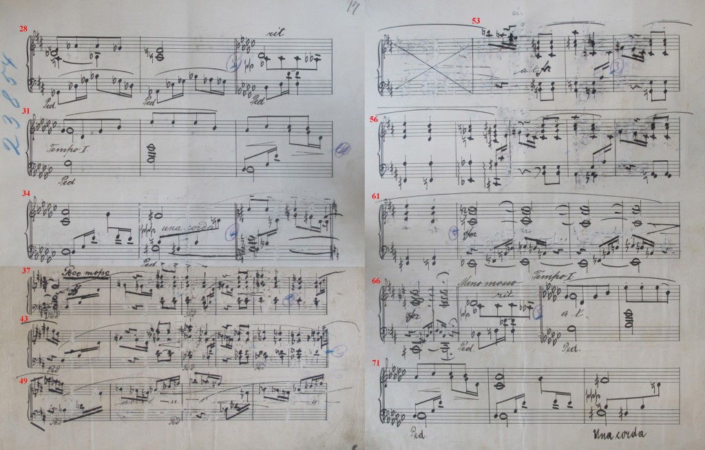 In copy 2, evidently copied initially line-for-line alike, just these measures were repeatedly revised, first through erasure, then with a paste-over for the first measures of the Poco mosso, enlarging the writing space by an accolade (to 6 instead of the previous 5). This was necessary because the accompanying figure now meanders through the fortissimo chords, requiring the insertion of several measures. But the paste-over was also repeatedly erased and corrected, making measures 37 to 52 very hard to read.