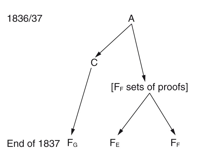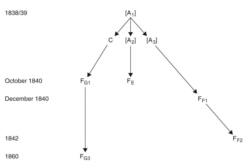 The source material, or so at least it is my impression, gets a bit more complicated with every scherzo. No autograph is extant for the b-minor Scherzo, whereas for the 2nd Scherzo we have both an autograph (A) as well as also a copy (C), checked through by Chopin. The autograph was used as engraver’s model for the French first edition (FF), the copy, for the German first edition (FG). Before the French edition appeared, however, Chopin read two sets of galley proofs; the state of the text after the 1st proofreading became the model for the English first edition (FE). Chopin did not proofread FE and FG. This interrelationship amongst sources can best be captured in a stemma: