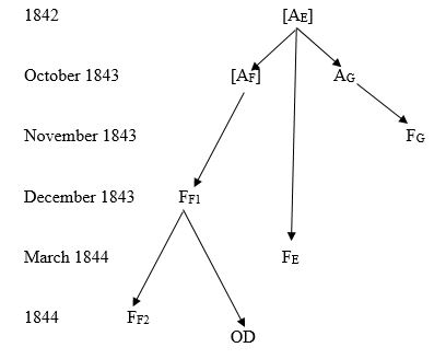 Complicating matters are especially the sources that did not survive, thus shown here in square brackets [ ]. Some will ask – rightly – how it is that besides the autograph AG I still must posit two other lost autographs. Well, there is first of all the source finding: The three first editions differ so much from each other that it is reasonable to assume three different engraver’s models. This surmise is corroborated by letters that Chopin sent friends in Paris from George Sand’s country estate Nohant in the fall of 1843. Here, he asks them to have two of the just-completed autographs (sources AE and AG) forwarded to the English publisher, for one, and to the German publisher, for the other. It is not documented, though highly likely that he wrote another autograph for the French first publisher (source AF) and had perhaps already submitted it personally in the summer.