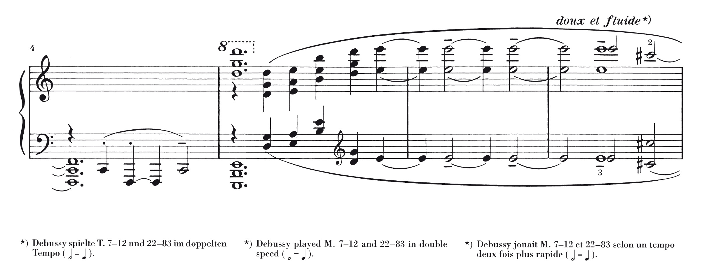 Here, Ernst-Günter Heinemann (Henle) expresses considerable doubts. When asked what source value Debussy’s recordings have for his Henle editions, he takes a clear position: They are important because of tempo questions, as in the example shown, but overall they would not have the value of the notated sources (thus, that of autographs or printed editions), being otherwise rather secondary. Accordingly, he does not intervene here in the music text, but merely refers in a footnote to Debussy’s tempo marking (in Préludes I, HN 383):
