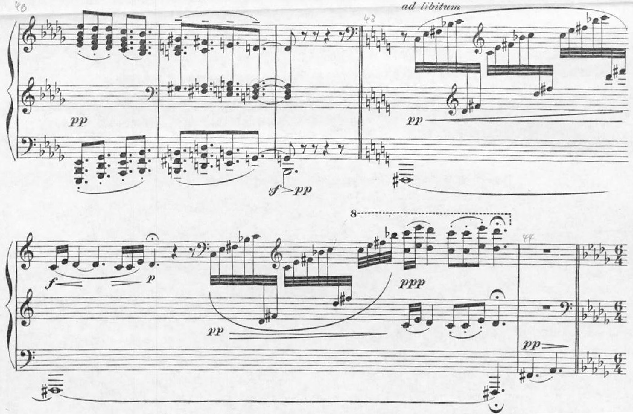 Like other composers, Debussy took a great deal of freedom with the music text: Lacking in La plus que lente are mm. 90–97, remarkable insofar as thus dispensed with is the repeat of the dynamic climax of mm. 86–89 in mm. 94–97 (in accordance with mm. 46ff.). In runs he also occasionally altered the notes, or as in m. 43 of D’un cahier d’esquisses, the character (ascending instead of undulating motion, in which presumably not intended were the a flat1 instead of b flat1 in the second run as well as also the re-striking of the bass tones):