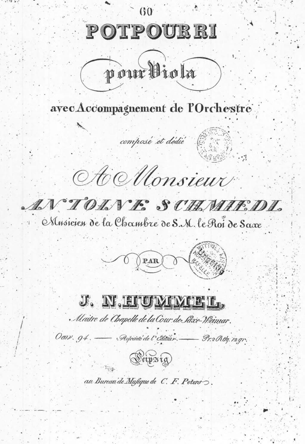 Hummel’s Potpourri op. 94 (HN 838) of 1820, containing about 60 percent borrowed music, also initially follows this blueprint and features popular melodies from Mozart’s Don Giovanni, Nozze di Figaro and Entführung aus dem Serail as well as from Rossini’s Tancredi. They are framed by a very successful Grave introduction and a Rondo closing section, offering an effective last dance. Even these two newly composed parts show that Hummel was able to do far more than mediocre arrangers at that time. In this potpourri, though, he also did not want to pander completely to the tastes of the “non-connoisseur” and therefore placed, in addition, a very “serious” fugue (!) exactly in the middle of the composition. So as not to bore the violist in all this, opus 94 is full of effective, sometimes really virtuosic passages.