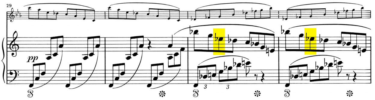 At first glance the e-flat2 in the right hand is actually strange – after all the clarinet (transposed here to A) and the left hand in the piano play an impeccable broken diminished chord b-flat–d-flat–e–g. And the right hand also plays these notes – up to just the questionable e-flat (and the interspersed passing note c). Wouldn’t this have to be a misprint…?