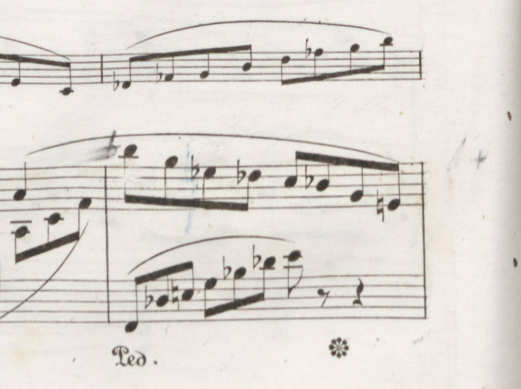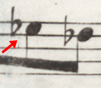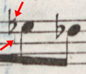 And I intend to identify still another indication of the correctness of the flat sign: in the copy of the first edition, recognized at just this spot can be traces of an engraving-plate correction, that is, the remnants of a deleted natural sign appearing faintly below the newly-engraved flat: