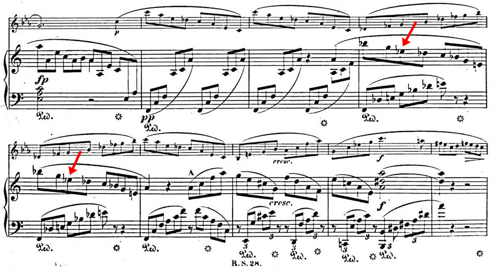 At first glance the e-flat2 in the right hand is actually strange – after all the clarinet (transposed here to A) and the left hand in the piano play an impeccable broken diminished chord b-flat–d-flat–e–g. And the right hand also plays these notes – up to just the questionable e-flat (and the interspersed passing note c). Wouldn’t this have to be a misprint…?