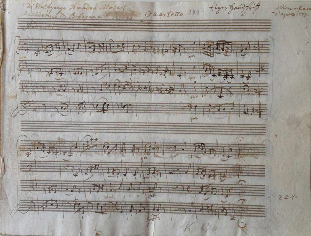 Today, I want to go into only one rather more external aspect of these quartets, namely, a small, but insightful inscription at the head of the autograph score for the C-major Quartet K. 170. This autograph was, incidentally, the only one that I was unable to examine in the original for my critical report in 1989. Meanwhile, this has also become available, that is, in the fantastic Paul Sacher Stiftung in Basel. Here, as a little service (only for my blog readers) is the overview of the Mozart autographs for these six string quartets, together with the link to their digital copies (as applicable):
