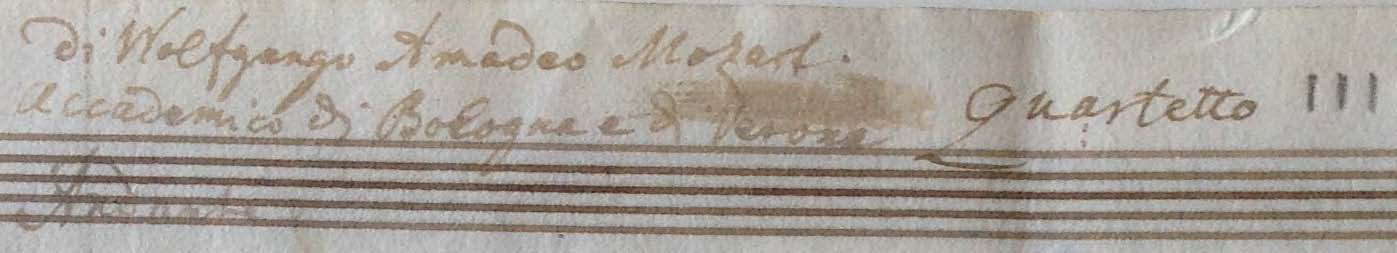 “di Wolfgango Amadeo Mozart. | accademico di Bologna e di Verona”, he writes in ink at the top left of the first page. Let’s recall: In 1770 at only 14 years of age, Mozart was accepted as a member into the noble “Accademia Filarmonica” of Bologna, after studying with the famous contrapuntist Padre Martini. Though why his father also mentions the Verona academy (was Wolfgang also a member of it?), I have no idea.