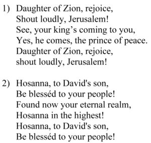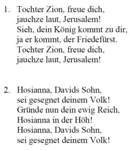 Ranke’s text is based on the book of Zechariah chapter 9, verse 9: “Rejoice greatly, O daughter of Zion; shout, O daughter of Jerusalem: behold, thy King cometh unto thee: he is just, and having salvation; lowly, and riding upon an ass, and upon a colt the foal of an ass.” [King James Version]. The song was published in 1826 in the collection “Christliche, liebliche Lieder [Lovely Christian Songs]” under the heading “Am Palmsontage [On Palm Sunday]”. It is not known how an Easter piece became an integral part of the Christmas season. Thomas Mann’s 1901 novel “Buddenbrooks” does, however, already mention the song within a Christmas context.
