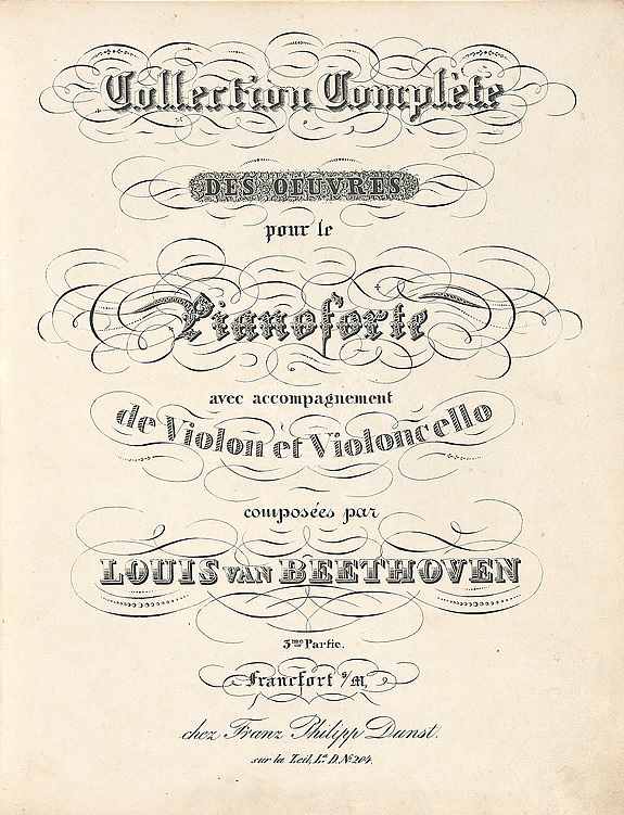The single successful, systematic project of a complete edition at that time could only be realised by a more unscrupulous publisher: In his Collection Complète des Oeuvres pour le Pianoforte […] composées par Louis van Beethoven, published from 1829, Franz Philipp Dunst, who seems only to have given the original publisher rights little consideration, managed within a few years to produce a complete edition of the piano and piano chamber music as well as a “Complete Collection of all the Songs with Piano Accompaniment” in 4 sections and 127 single volumes. With this edition he delivered for the first time the “Beethoven Complete” that could be realised at home on and around the piano. Included were first editions such as the piano trios WoO 38 and 39, whose authenticity and origin Dunst explained on a specially inserted leaf and had signed by Anton Diabelli, Carl Czerny and Ferdinand Ries.