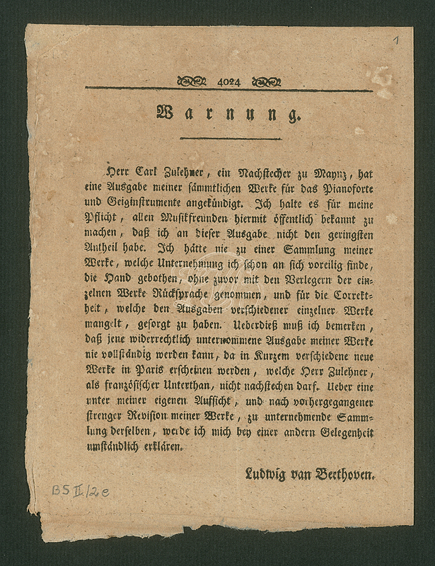 That means, plainly: In his Collection complette des oeuvres de musique pour le piano forte composées par Louis van Beethoven, Zulehner simply reprinted the composer’s works that had already appeared in far-off Vienna, Leipzig or London, without concerning himself about Beethoven’s consent or taking into account the original publishers’ rights! Beethoven was, accordingly, “not amused” and published explicit “warnings” in the Vienna and Leipzig press in the autumn of 1803 about this “copycat engraver in Maynz”.
