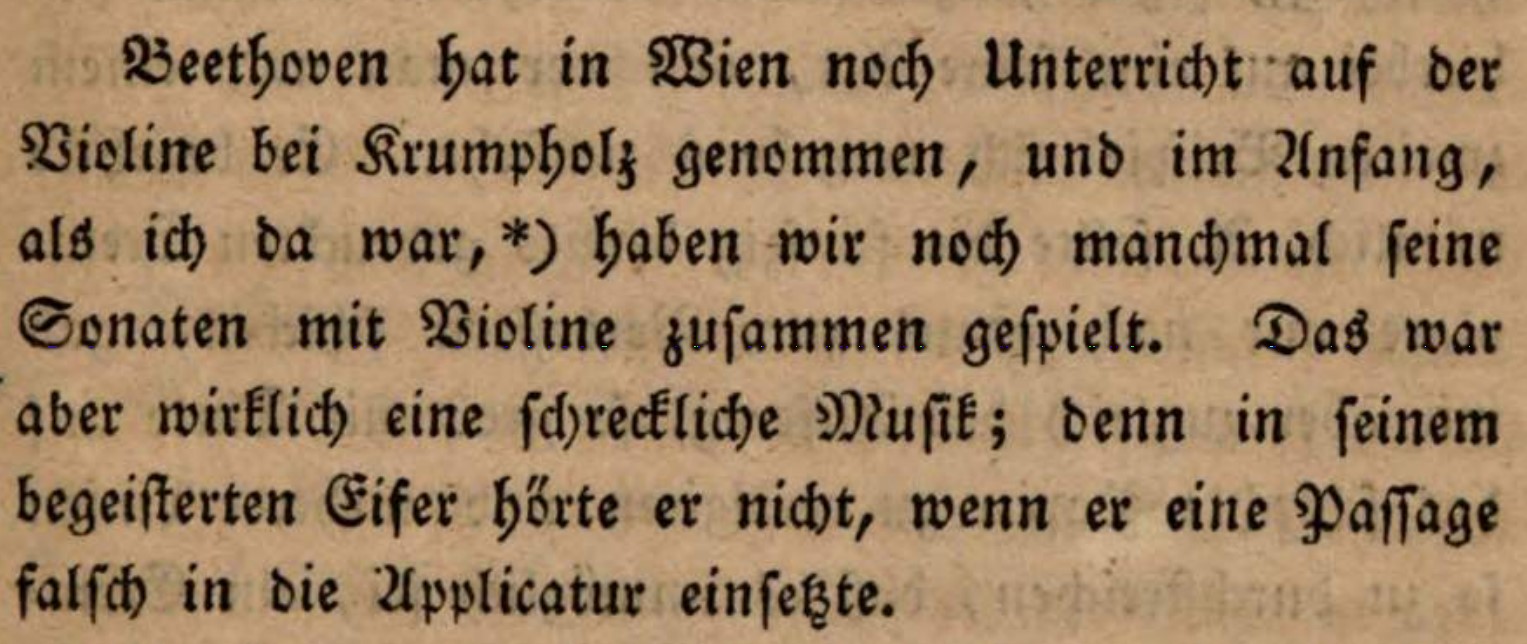‘Beethoven took lessons on the violin from Krumpholz, and at the start when I was there*), we still sometimes played his sonatas with violin together. But that was really a dreadful music; for in his enthusiastic keenness, he did not hear when he wrongly fingered a passage.’