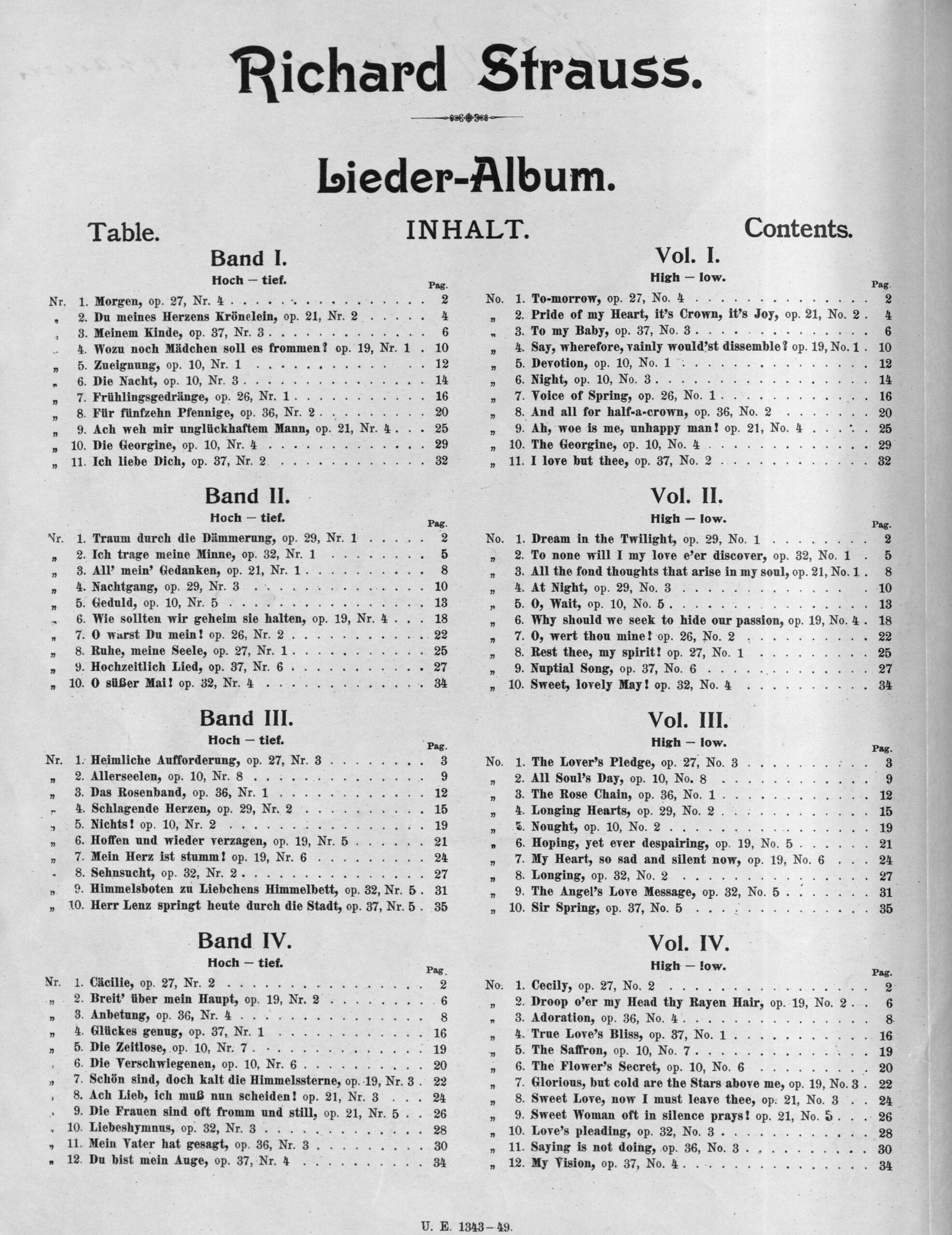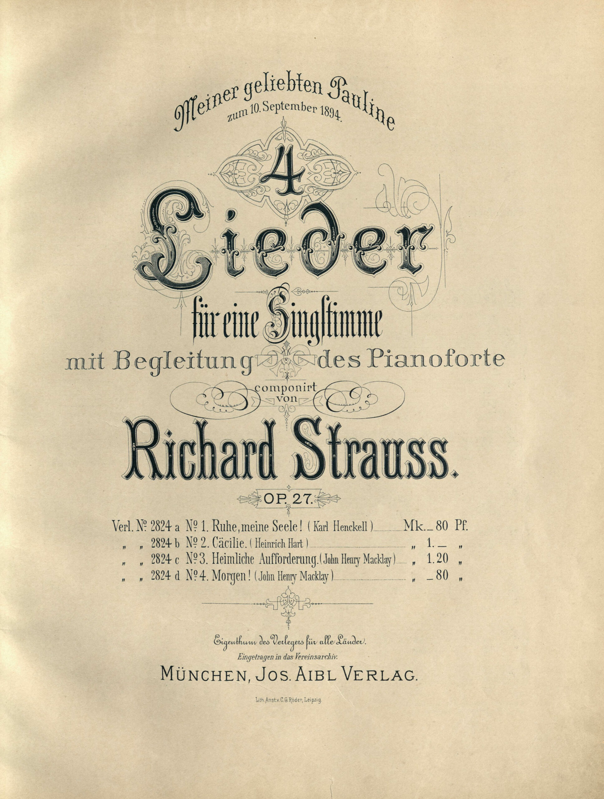 It all started in 1887 with the Acht Gedichte aus „Letzte Blätter“ von Hermann von Gilm op. 10 in two volumes, each of four lieder, followed by the likewise published volumes of opp. 19 (Sechs Lieder aus „Lotosblätter“ von A. F. Schack, in 1888), 21 (Schlichte Weisen. Fünf Gedichte von Felix Dahn, in 1890) and 26 (Zwei Lieder nach Nikolaus Lehnau, in 1894). The Vier Lieder op. 27, which Strauss presented as a wedding gift “To my beloved Pauline on September 10, 1894”, appeared in four single editions, as was to become the rule from then on.