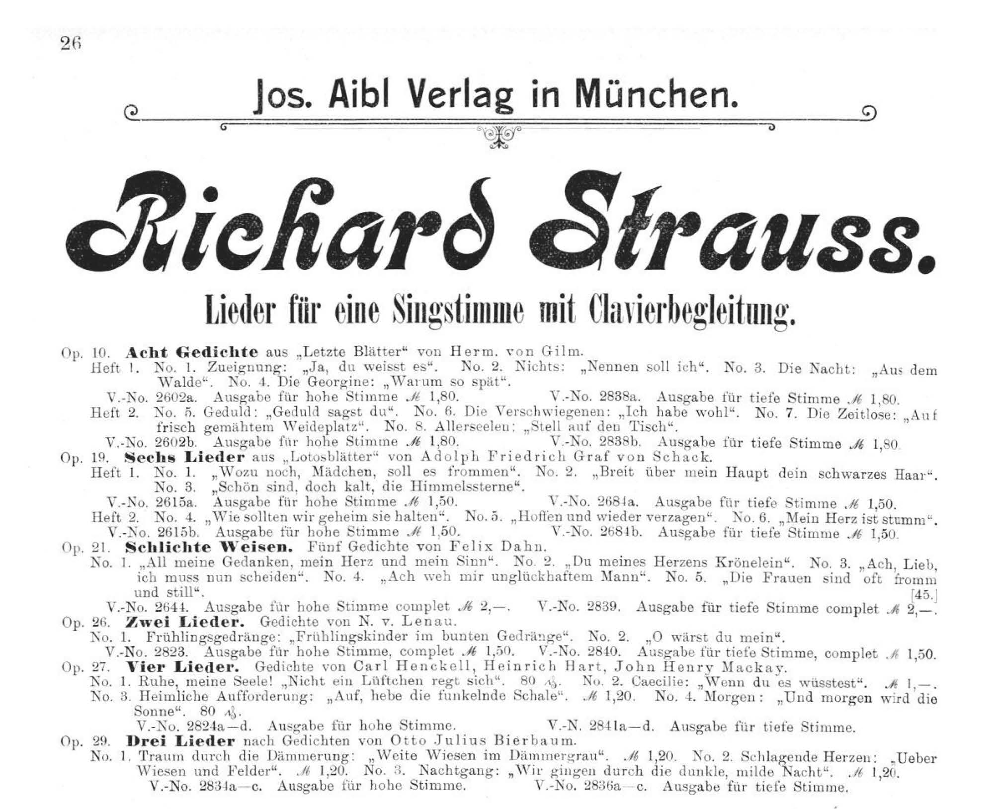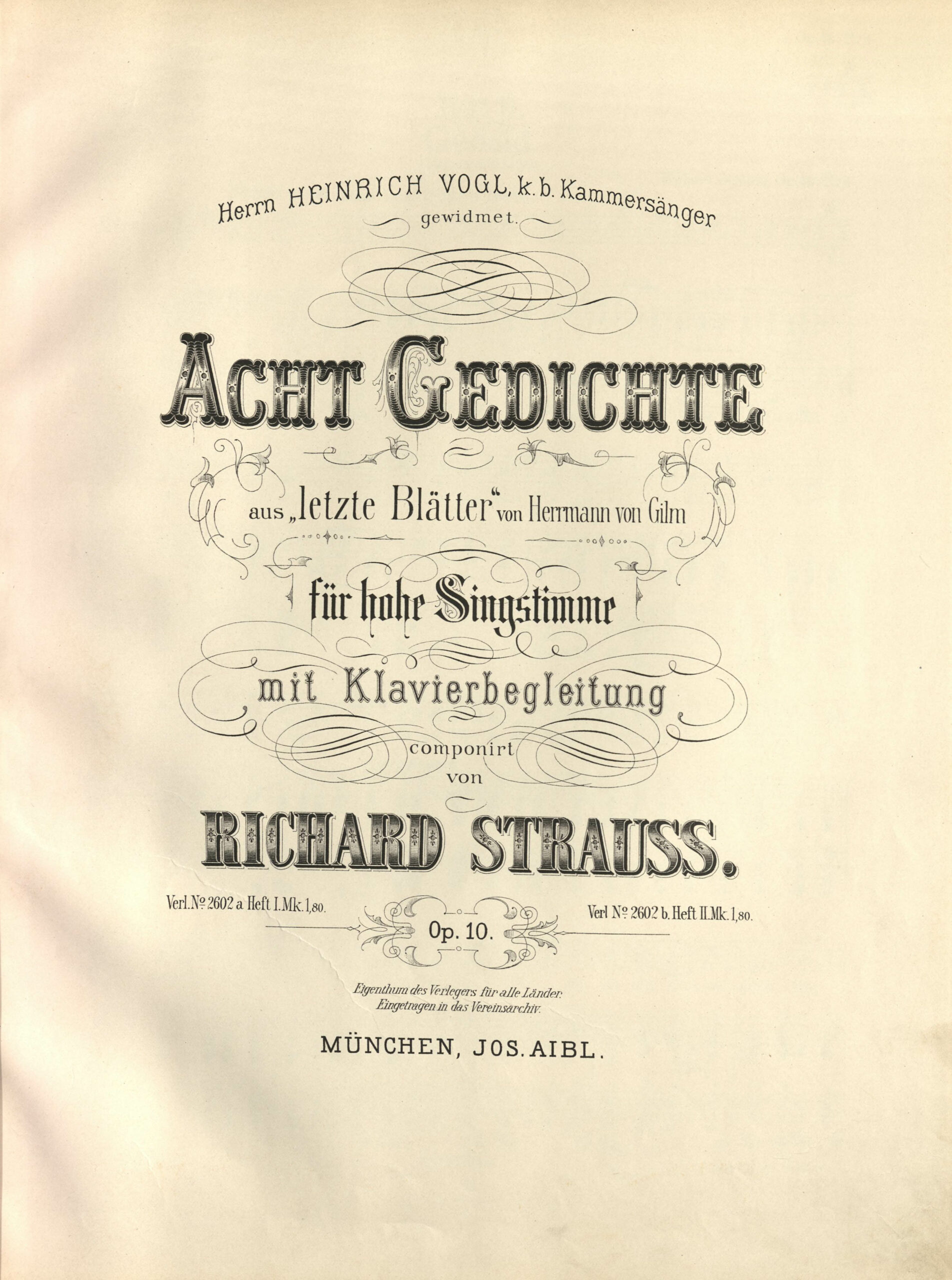 Both opus numbers were published by the Jos. Aibl publishing house in Munich, directed by Eugen Spitzweg, together with his brother Otto. Eugen Spitzweg, who was paternally devoted to Strauss, deserves credit for having supported the young composer as his first publisher, bringing out between 1881(!) and 1899, thirty of Strauss’s works, including chamber music, concertos, symphonic poems and his maiden opera effort, Guntram, as well as also nine lieder opus numbers with a total of more than forty lieder. And that, although Spitzweg had initially replied defensively to his protégé’s lied offers, that he “would prefer other things – you know my dread of vocal works”!