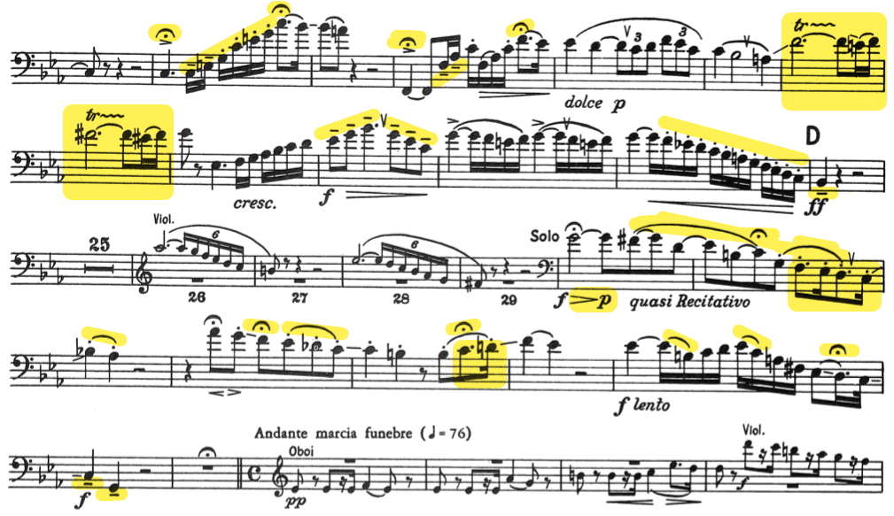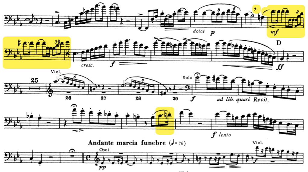 The solo part of the cello version does, of course, differ from the original in many small details, owing to its arrangement as idiomatic for a string instrument: different positioning of slurs, sometimes different broken chords and figurations, use of double stops, and much more. David furthermore transposed the piece down a semitone, to the key of D major that is better suited for the cello. This arrangement, however, often provides helpful indications and confirms engraving errors in the original trombone version. Here is an example: