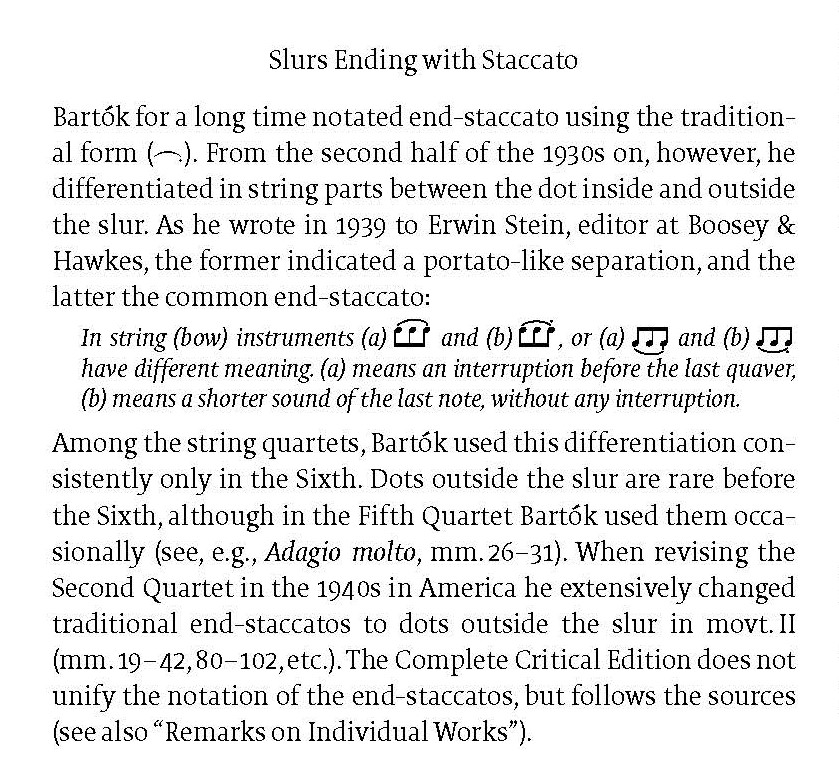 LS: Just look at the engraving and layout of the music: the first editions of Bartók’s quartets were published between 1909/10 and 1941 by different publishers in very different engravings, some of them with very crowded page layouts. The new edition with a uniform printing style suggests a fresh re-reading of the six well-known scores. More important is that the stepwise changes in Bartók’s notation – often forced by editors of his publishers, think, for example, of tempo and metronome markings – are unified here as far as possible. But in my opinion, most crucial are, without question, the necessary rich numbers of editorial footnotes explaining variant readings, possible choices, genuine problems. Performers may hate searching for notes in the back of the volume (or in an appendix volume) but prefer a short footnote explanation on the same page of the full score.