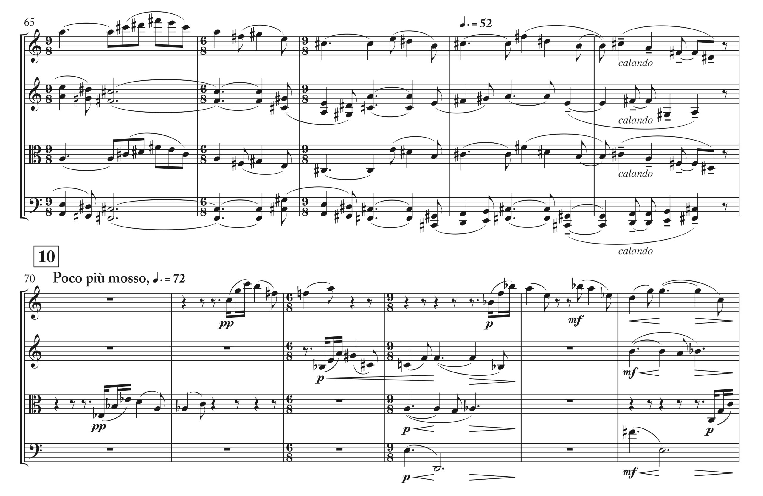 Our perusal of various quartets led to astonishingly various findings: Whereas in some of them cue notes were even considered superfluous in view of the piece’s great degree of difficulty – definitely not to be sight-read – in others, additional small cue-note staves could be introduced in so many places that the separate parts would have become as thick as books….  So, we had to gauge the situation, deciding on a middle course for this quartet: with considerably more cue notes than in the first edition, facilitating entries, especially in rhythmically-metrically intricate places – such as, for example, at the first movement’s rehearsal number 10, where encountered are tempo changes together with syncopated figuration: