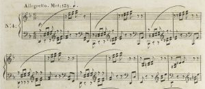 In comparison with the first version, the etude is now considerably extended (169 instead of 77 measures) and has a theme that is subsequently changed melodically, harmonically and compositionally in five variations. The opening, now in 6/4 time, shows the idea of thirds retained as a voice in both hands, but receding before the new, full-fingered theme in the treble. The middle and bass voices complement each other to form triplet lines covering the entire measure, whilst the tempo changes from Allegretto to Allegro. The theme’s shape is already very similar to the final version (cf. Fig. above) with its three clearly distinguishable tonal registers and a strikingly prominent main idea. The measure is correctly filled out in all three lines; noticeable is only that the eighth-note triplets are not marked as such.