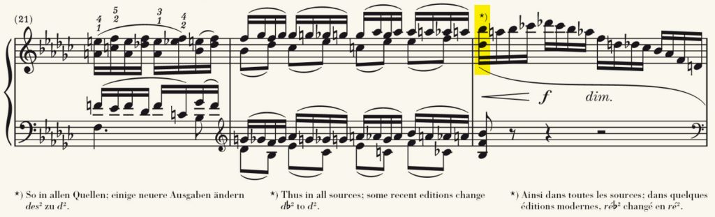 There are, nevertheless, also good arguments against a change, such as, for example, a cautionary flat sign in m. 23 before the 4th note c-flat2, without having had a c directly before it (in m. 22 there is a c2 on beat 3, but the left hand already has c-flat1 again on beat 4). Perhaps both cautionary signs are only brought about by the natural sign before the 2nd note in m. 23. Moreover, m. 9 is only roughly similar to m. 23, but not really a parallel passage; for example, the climax in m. 9 is on the 1st chord, whilst in m. 23 the phrase “overshoots the goal”, so to speak, and only culminates on beat 2 (the d-flat3!) – see also the different dynamics and continuation of the respective passage.