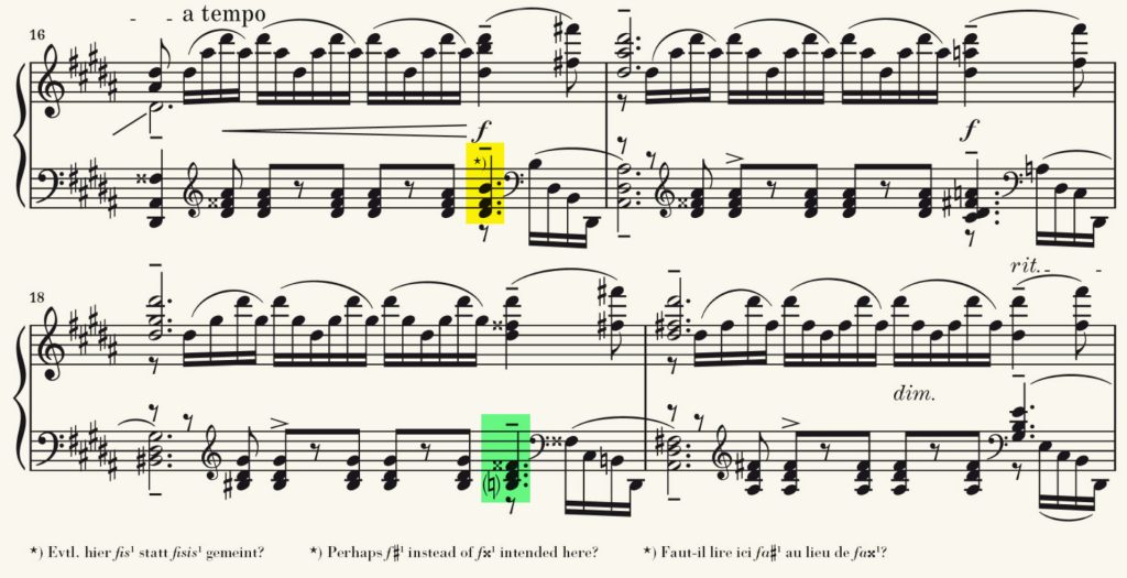 Mark Sullivan’s plausible assumption is now that an accidental is also to be added in the analogous place in m. 16 (see the yellow highlighting), namely a sharp sign before the f-sharp1 (instead of f-double sharp1 as before). This question can alas be answered less clearly by the musical context than that in the previous case. The clash of (harmonic) f-double sharp1 in the left hand and (melodic-motivic) f-sharp2/f-sharp3 in the right hand is in any event still no reason for suspicion, for this also happens in m. 18. The explicit cautionary accidentals before the last right-hand chord in m. 16 (these sharps are not actually necessary) could even be an indication of just this deliberately intended cross relation.