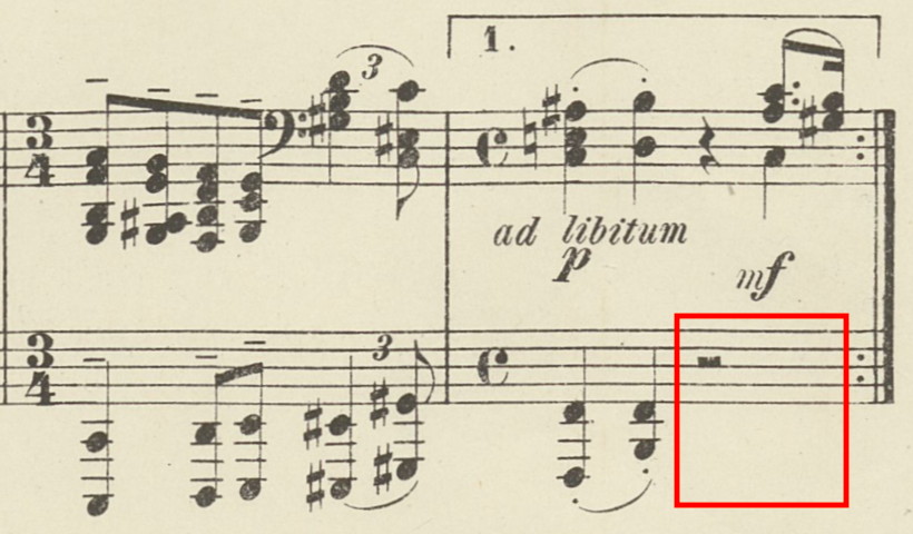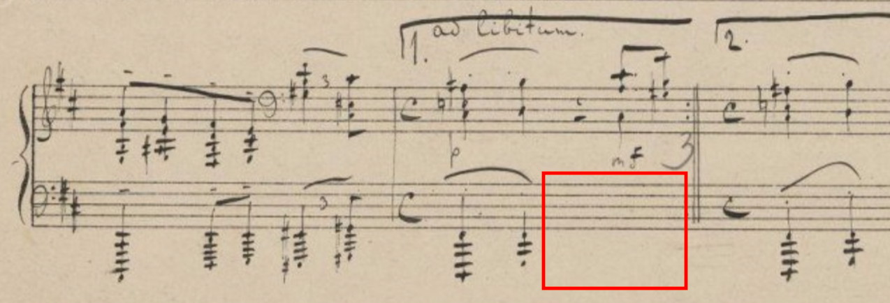 So, in the absence of comparative sources, it’s hard to decide whether he really wanted rests in m. 45 at the bracketed repeat in the Moment musical no. 3, as printed in the first edition:
