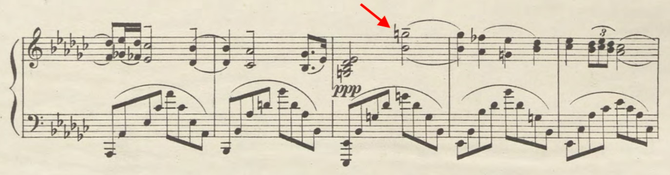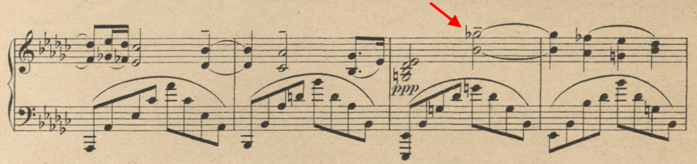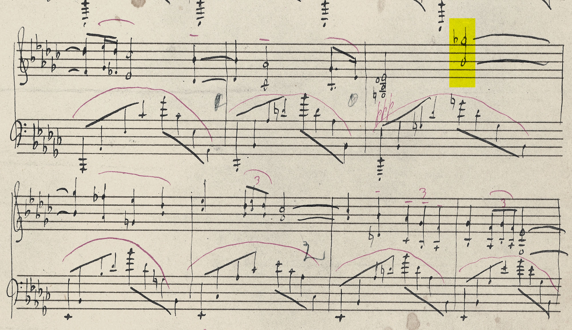 And who could blame him, when concurrently heard is a g natural in the left hand – isn’t an E-flat major seventh chord absolutely meant in this measure…? And yet Rachmaninoff intended something else: in the autograph he clearly wrote a flat sign before this note in the upper voice, which is not supposed to be harmonic, but to retain the g flat of the main theme as a melody note, following the g flat-f flat-e flat-d flat line: